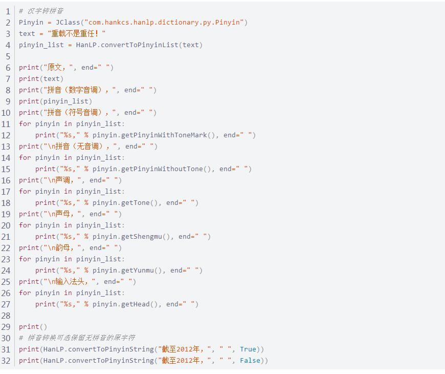· HanLP能够识别多音字,也能给繁体中文注拼音。