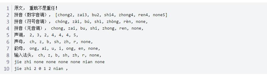 · HanLP不仅支持基础的汉字转拼音,还支持声母、韵母、音调、音标和输入法首字母首声母功能。