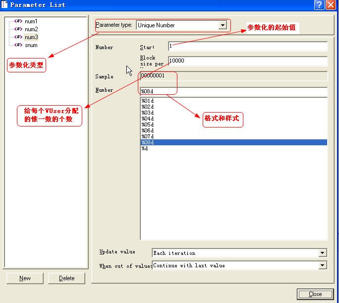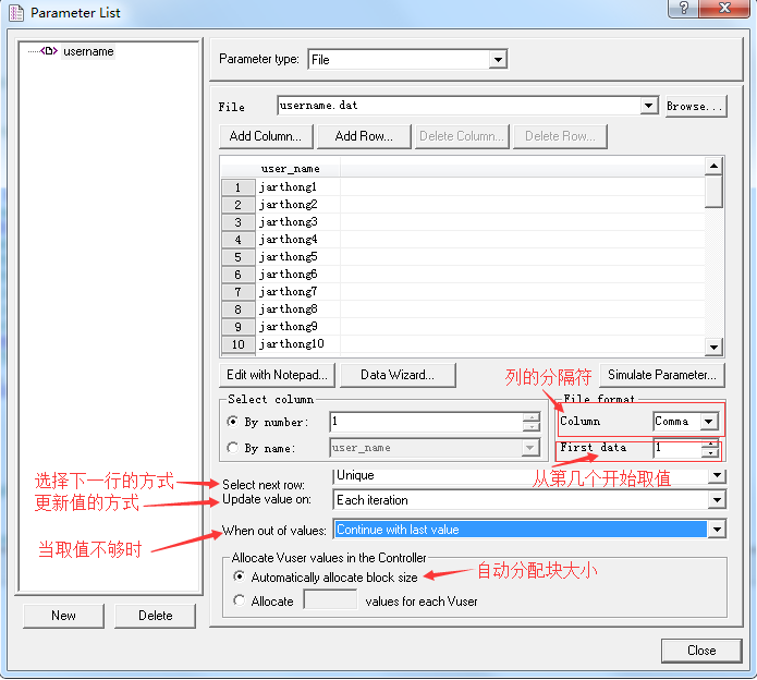 于是尝试loadrunner自动的参数化功能,但是对这块的功能不是很了解,不过还好设置不多,多做几次试验就可以明白,于是着手研究。经过多次测试终于发现了该规律,在下图注释一下: