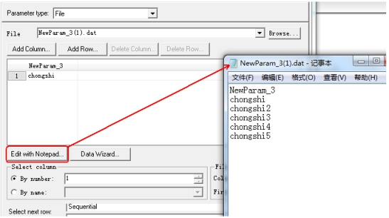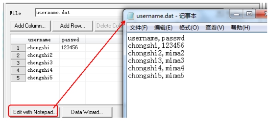 点击“Edit with Notepad”再次编辑参数化数据文件,使用户名密码建立一一对应关系。