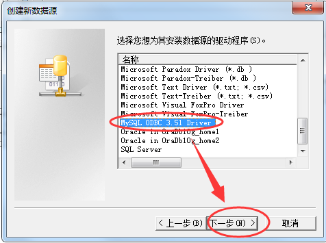 选择对应数据库的驱动程序,win7中自带没有MySQL的数据源驱动,需要下载安装。(mysql-connector-odb)