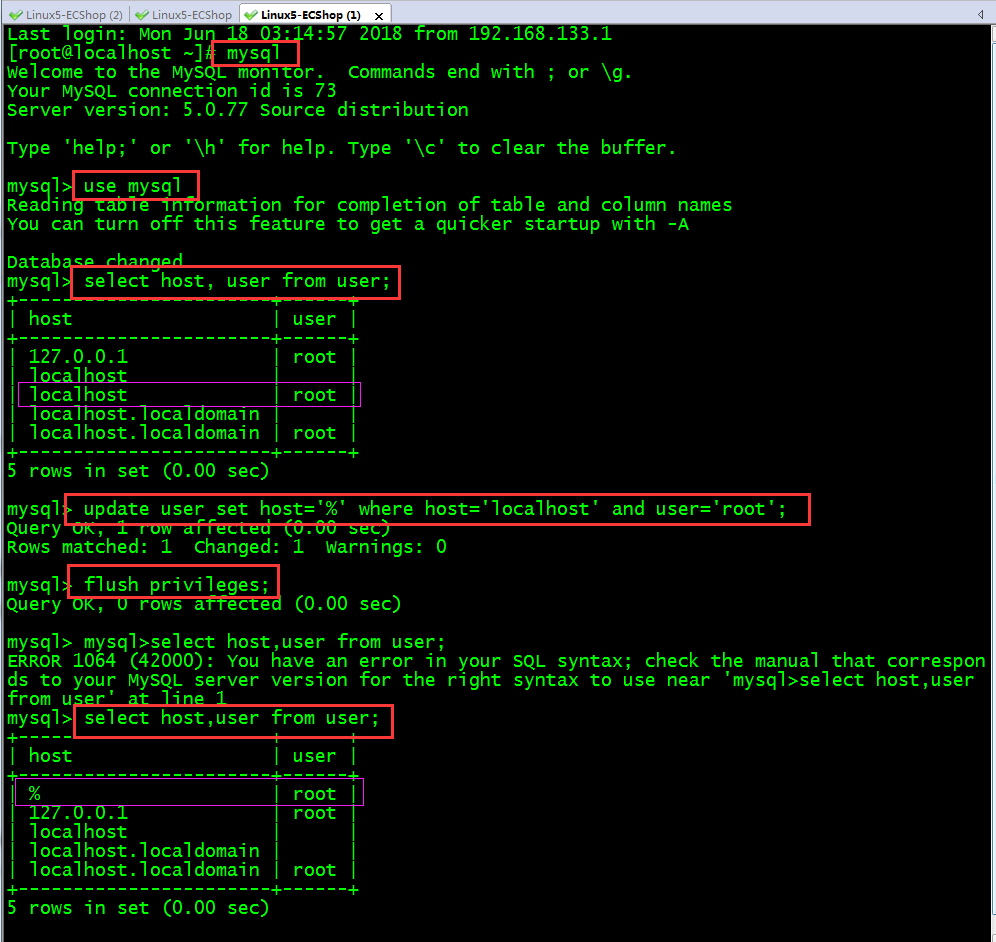 2、mysql>update user set host='%' where host='localhost' and user='root';