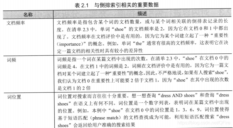 由词典和倒排表组成。倒排表中描述单个词和包含该词的文档列表与之对应。