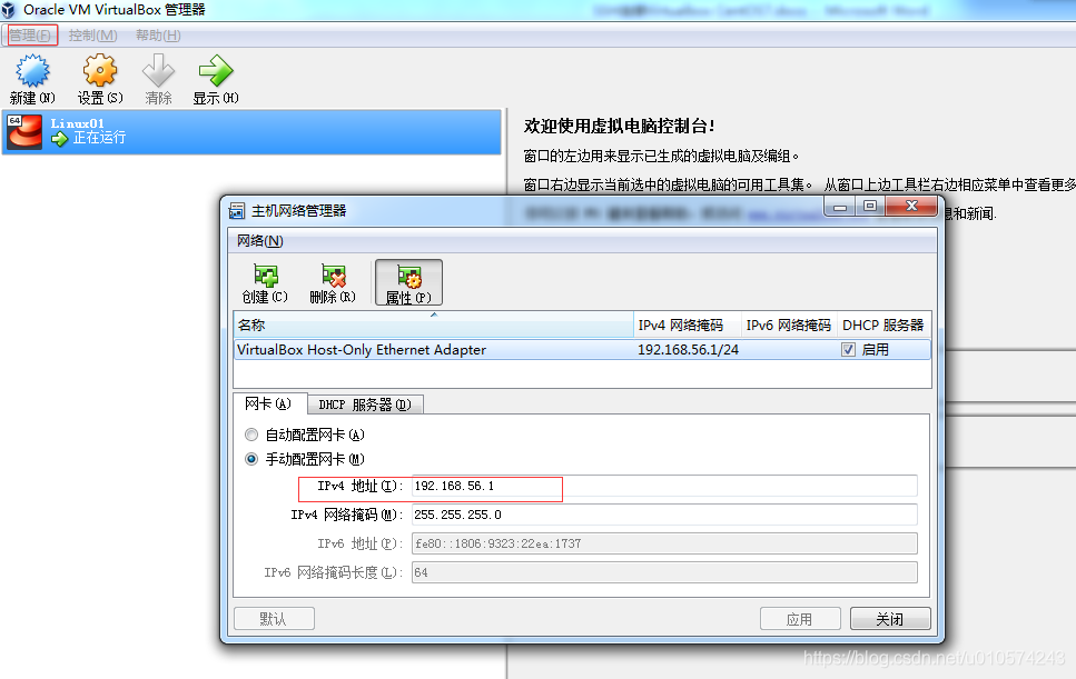 注意:virtualbox下ifconfig看不到linux真正的ip,需要通过管理 –〉主机网络管理器查看