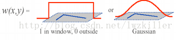 - w(x,y)是窗口函数,一般是以窗口中心为原点的高斯函数,最简单的是窗口内所有的像素对应的权重都设为1,如下图的两种情况