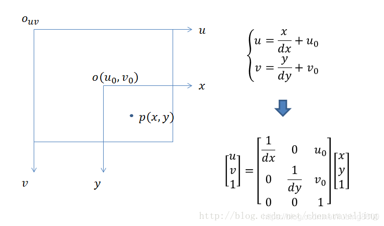 此时投影点p的单位还是mm,并不是pixel,需要进一步转换到像素坐标系。