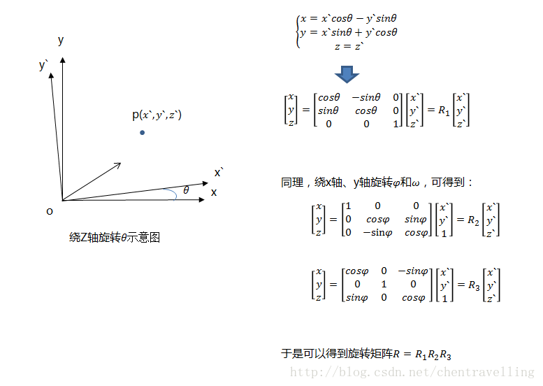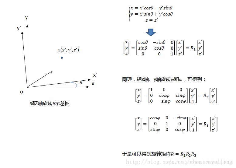 于是,从世界坐标系到相机坐标系,涉及到旋转和平移(其实所有的运动也可以用旋转矩阵和平移向量来描述)。绕着不同的坐标轴旋转不同的角度,得到相应的旋转矩阵,如下图所示: