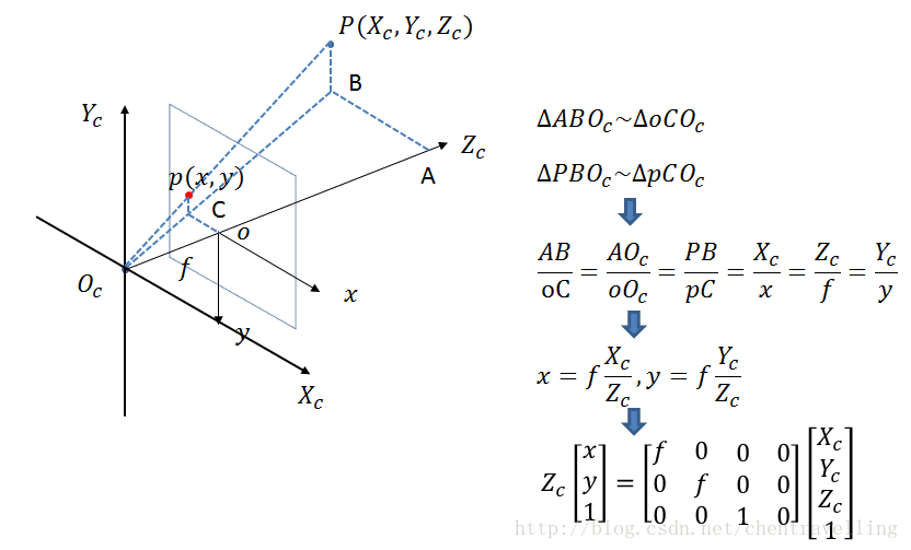 从相机坐标系到图像坐标系,属于透视投影关系,从3D转换到2D。