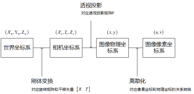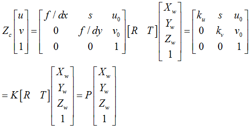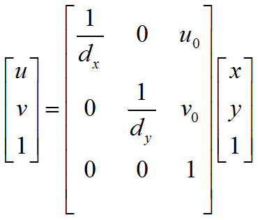由两个坐标系间的关系我们可以得到如下的转换关系:其中dx和dy表示每一个像素在u轴和v轴方向上的物理尺寸: