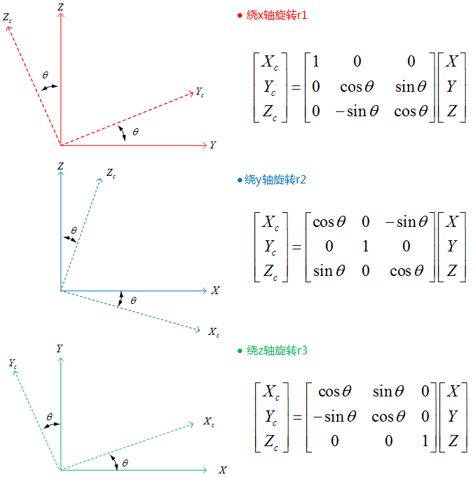 有了上部分的内容,其实很多读者还想知道那旋转矩阵和平移矢量究竟是如何求得的呢?其实平移矢量我们很好理解,就是我们沿着各轴方向的平移量。而旋转矩阵却不是很好理解,在这里我们做一个具体的说明: