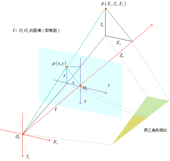 这个转换呢,其实我们非常好理解,就是一个透视的关系,而实际运算过程中呢也就是利用三角形的相似性来进行计算的,首先我们看一下两个坐标系间的透视关系示意图: