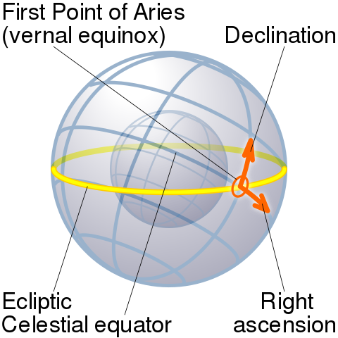 | 赤道坐标系(Equatorial) | 地心/太阳心 | 天球赤道(Celestial equator) | 天极 | 赤纬(Declination (δ)) | 赤经或时角(Right ascensionor hour angle) | 春分(Vernal equinox) |