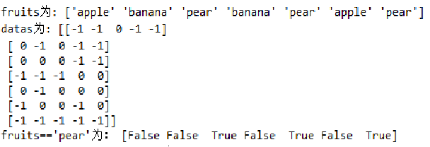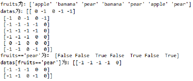 1.datas[fruits==‘pear’]可以通过布尔型索引datas中的元素(输出对应位置为true的行)