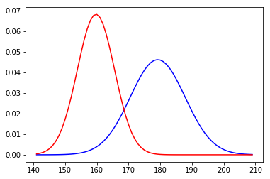 f_predict = stats.norm(mu2, std2).pdf(data_test) # 女生分别的预测