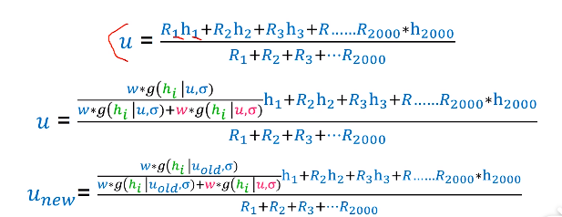 现在来更新男/女分布的期望值(这个期望值与E步求期望不同)u,这个计算的思想就是:所有样本中为男/女分布的概率乘以当前身高值之和,然后除以个数据为男/女分布的概率之和,这里需要注意一下,以往我们计算均值就是各个数据之和除以数据量即可,此时,由于每个身高前已经乘以相应概率值并将这些乘积结果数据相加,这就相当于以往的数据求和部分,相除的数是所有为男/女分布概率之和,而以往的计算只是一个确定的特例而已,可看下式:
