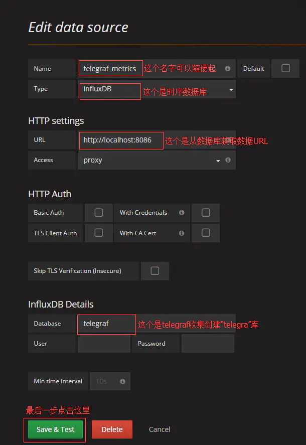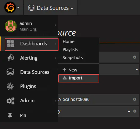 1).登陆grafana , 左上角菜单新建数据源 , 并配置好相关信息