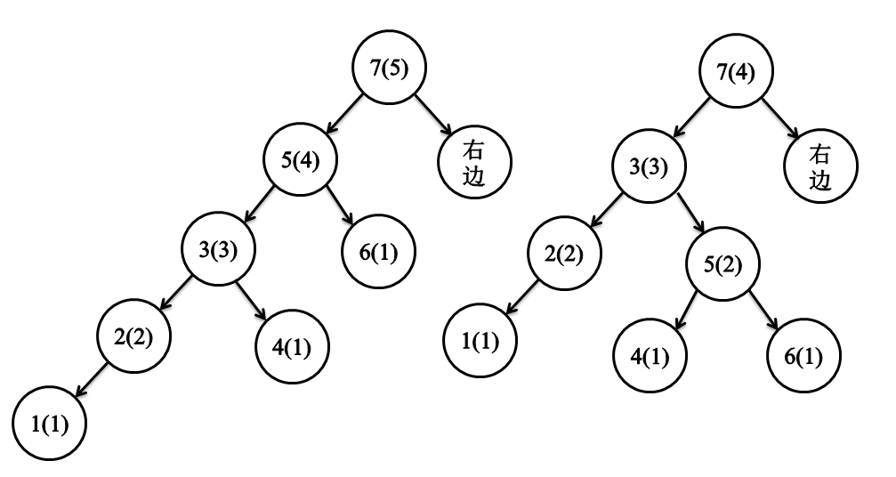 上面的图可能会有一些不严谨,比如7节点的高度不一定会变化等,但是我们的重点是如何理解那个右旋,对于左图,我们根据括号里面的高度,能够很快知道,节点5不平衡。按照我们前面说的,将5右移到3的右节点,把3的右节点移到5的左节点即可。总结起来就是: