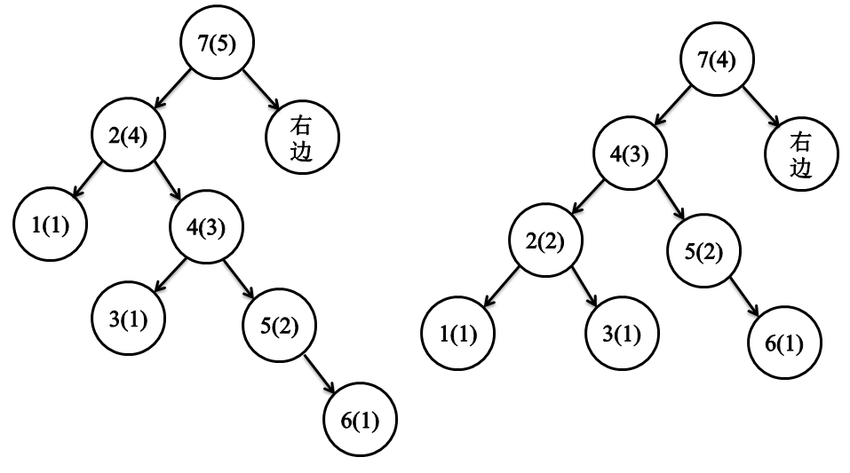 左边的情况,3节点的左右子树高度差为2,要想平衡左右子树,那必须让3的右子树的高度加1,可是从哪里借一个节点呢?从左子树借,因为左子树的值都小于3,不能放在3的右子树上,因此只能把父节点3借来,使AVL树达到平衡。