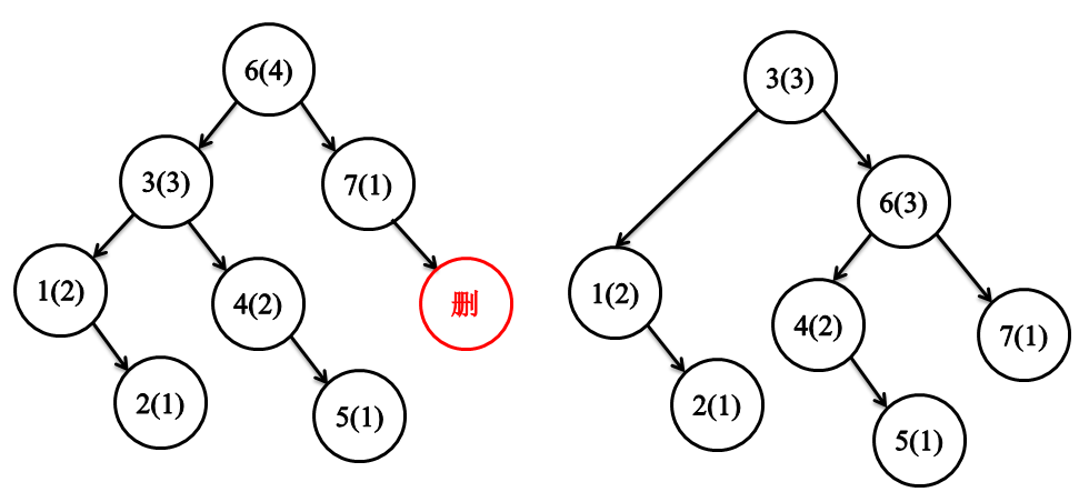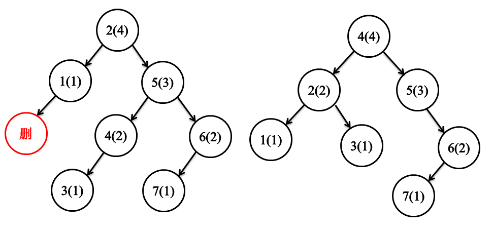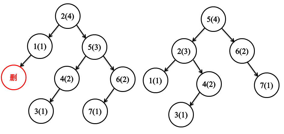 AVL树的删除部分和二叉搜索树的删除方法一模一样,但是删除节点后,可能使其子树节点的高度减一,进而造成左右子树节点的高度差为2,从而破坏AVL树的稳定性。和前面插入一样,我们仍然需要考虑删除节点后的两个问题,一个是父节点的高度如何改变,二是AVL树稳定性被破坏后如何维稳。
