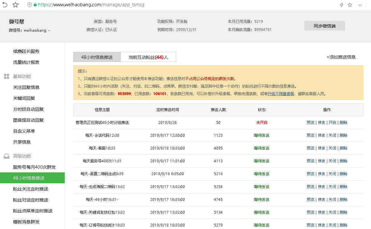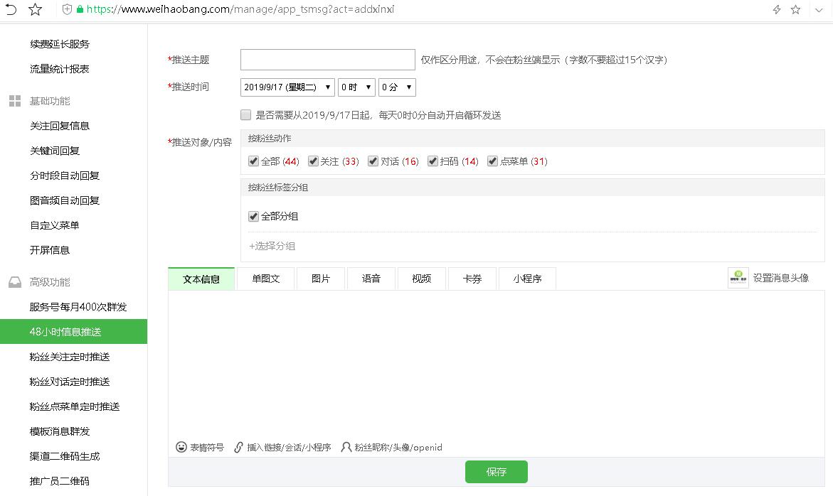 公众号48小时内活跃粉丝,不限制次数推送消息给粉丝,所有格式类型都能发送。