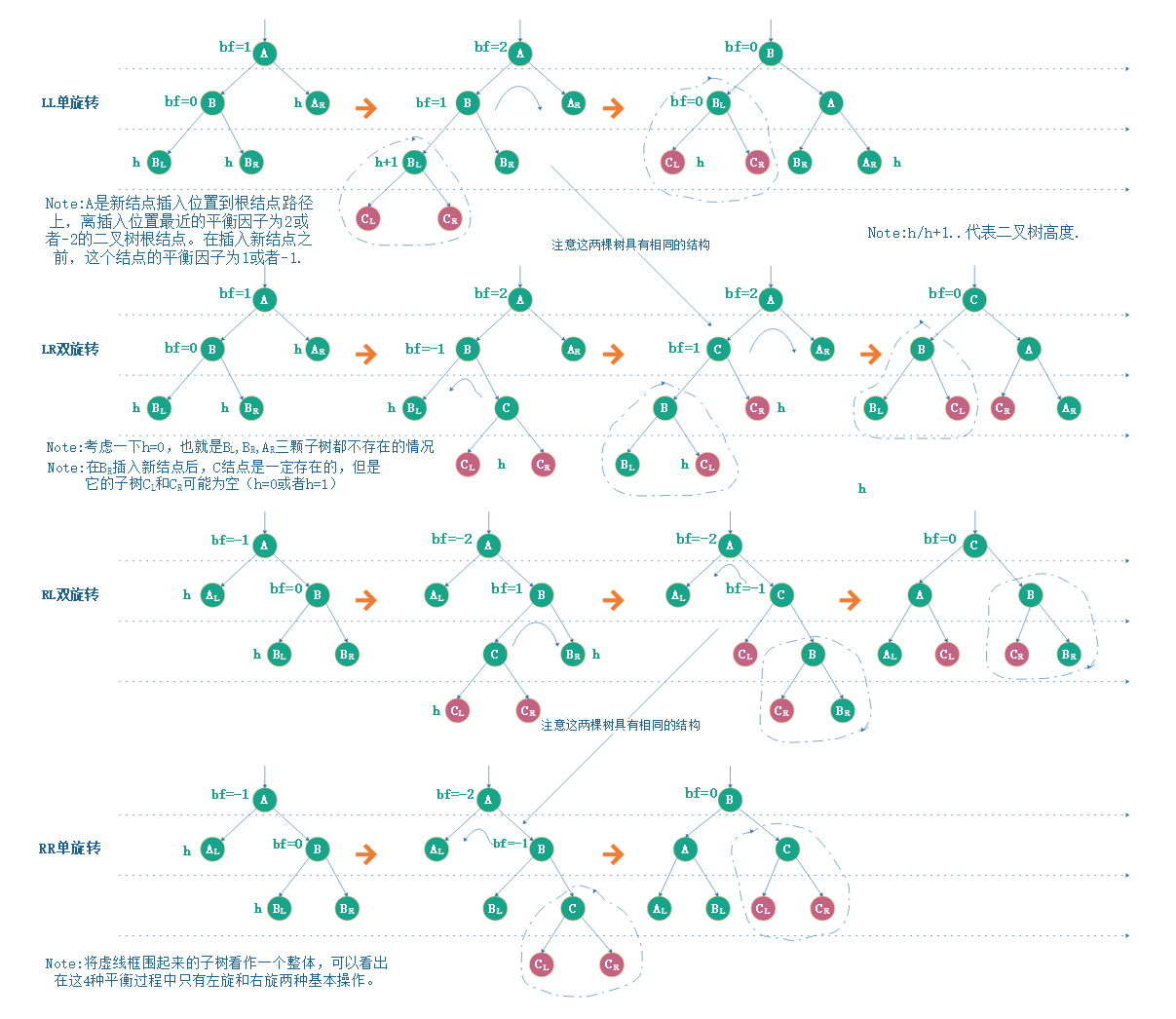 通过这张图来描述AVL平衡树在插入新结点过程中,通过旋转操作来达到自平衡的四种场景: