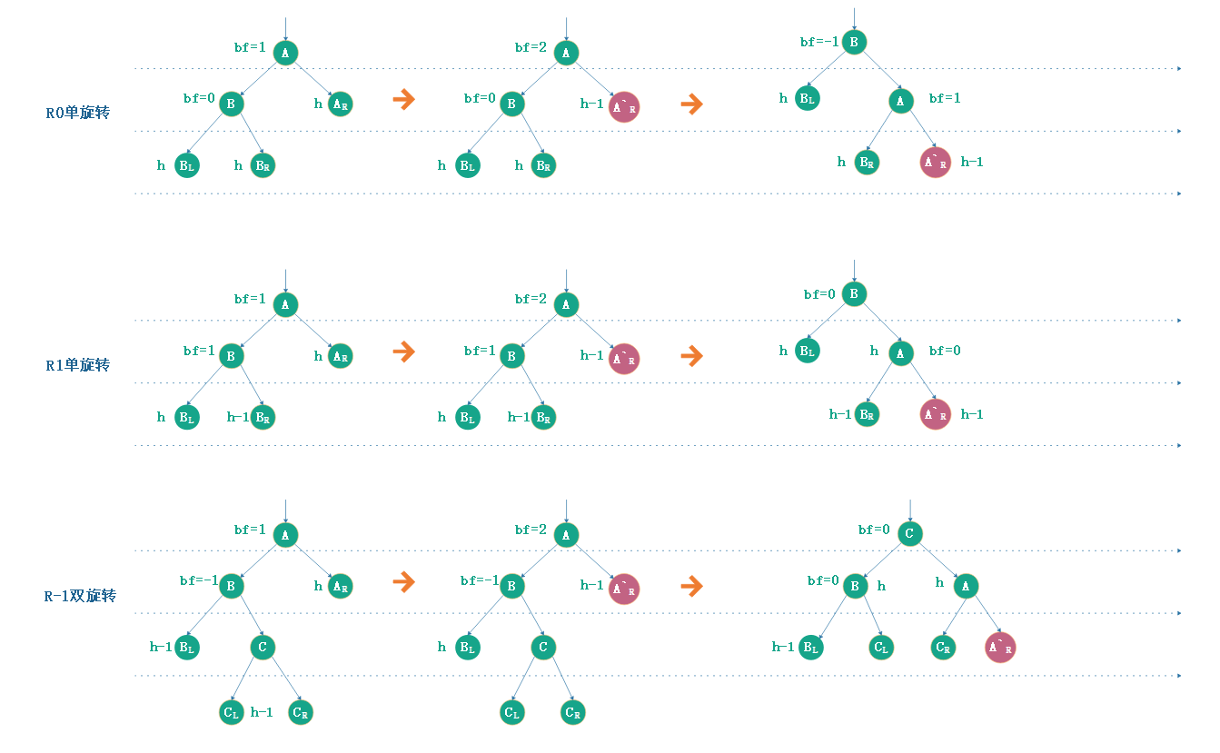 - R0单旋转:删除的是A右子树的结点,删除后A的平衡因子为2,并且其左子树的平衡因子为0,一次右旋操作即可重新达到平衡。