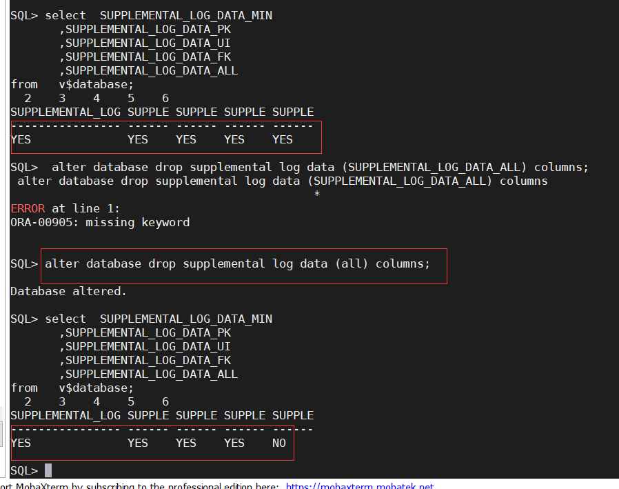2、2确认:除SUPPLEMENTAL_LOG_DATA_ALL外,均开启附加日志