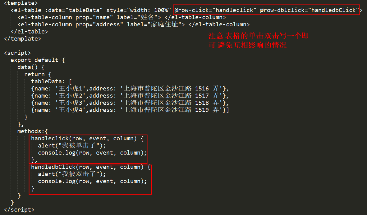 <el-table :data="tableData" style="width: 100%" @row-click="handleclick" @row-dblclick="handledbClick">