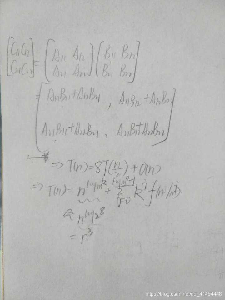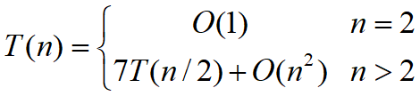 其中ac等要花费的时间:(n/2)^2=n^2/4,有四个部分:有T(n)=4*T(n/2)+O(n)。