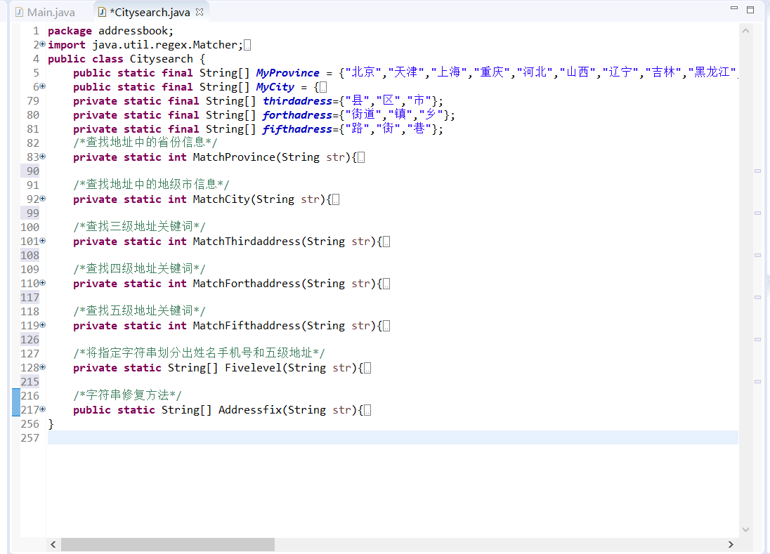 代码一共两个类,一个是Main类,另一个是Citysearch类。Main类中只有一个方法也就是main方法,标志着程序执行的起点。main方法的主要职能就是读取文件,处理文件内容,然后输出到文件。Citysearch类是一个静态类,这样就可以直接使用类名调用它的方法,Citysearch类主要用来存储省份信息和地级市信息、提供Fivelevel()方法将损坏的地址信息划分成五级地址、提供Addressfix()类可根据要求将地址信息划分为五级或七级,其中Fivelevel()方法只为Addressfix()方法提供服务。其余的方法就是为这两个方法的实现提供服务。下图是Citysearch类的所有方法,其功能在注释中都有说明,由于代码过长所以详细代码都已经折叠。