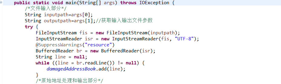 异常处理就是在Main方法的“读取文件、处理文件、输出文件”代码段使用了IOexception。由于对于自定义异常的使用还不太熟悉,所以在代码其他地方就都使用条件判断逻辑避免特殊情况发生来代替异常。