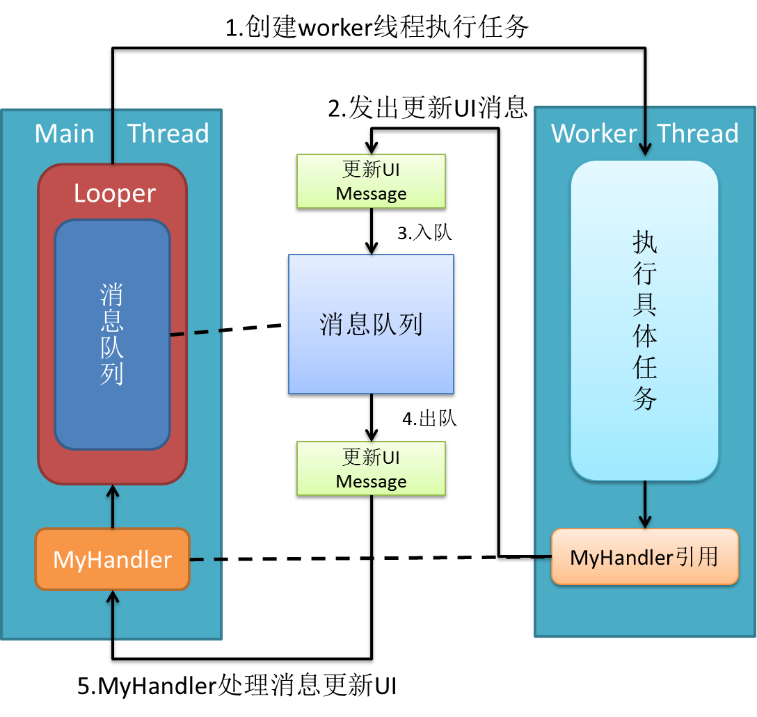 这就解决了android最经典的不能在其他非主线程中更新UI的问题。android的主线程也是一个looper线程(looper 在android中运用很广),我们在其中创建的handler默认将关联主线程MQ。因此,利用handler的一个solution就是在 activity中创建handler并将其引用传递给worker thread,worker thread执行完任务后使用handler发送消息通知activity更新UI。(过程如图)