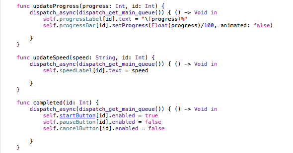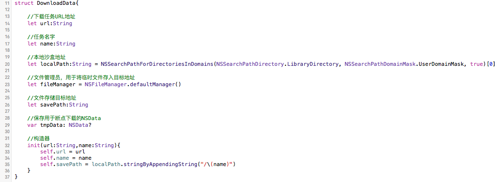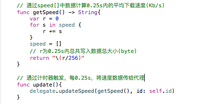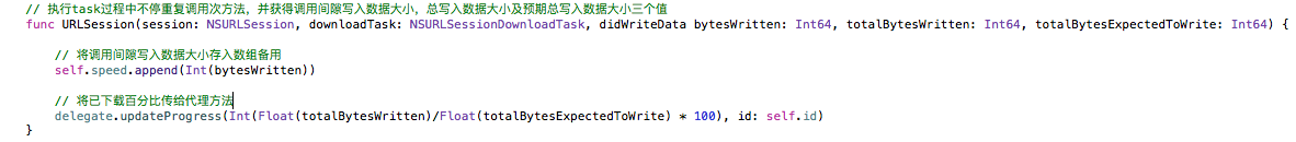 ![]() 功能: -单个任务下载 -暂停下载任务 -取消下载任务 -断点下载 -显示下载进度及速度 -多任务下载 -分别控制各个任务 在如今移动互联网的浪潮中,手机APP越来越依赖网络通讯来交互数据。今天我们就来分享下如何通过使用NSURLSession这个Apple官方提供的网络接口实现文件下载的思路。 NSURLSsession 先来介绍下NSURLSession这个接口。NSURLSession是苹果在WWDC2013上推出的用于替代它的前辈NSURLConnection的。 与NSURLConnection类似,除了同名类NSURLSession,NSURLSession也是指一组相互依赖的类。NSURLSession包括与之前相同的组件,例如NSURLRequest, NSURLCache等。NSURLSession的不同之处在于,它把 NSURLConnection替换为NSURLSession, NSURLSessionConfiguration,以及3个NSURLSessionTask的子类:NSURLSessionDataTask, NSURLSessionUploadTask, 和NSURLSessionDownloadTask。 与NSURLConnection相比,NSURLSession最直接的改善就是提供了配置每个会话的缓存,协议,cookie和证书政策(credential policies),甚至跨应用程序共享它们的能力。这使得框架的网络基础架构和部分应用程序独立工作,而不会互相干扰。每一个NSURLSession对象都是根据一个NSURLSessionConfiguration初始化的,该NSURLSessionConfiguration指定了上面提到的政策,以及一系列为了提高移动设备性能而专门添加的新选项。 NSURLSession的另一重要组成部分是会话任务,它负责处理数据的加载,以及客户端与服务器之间的文件和数据的上传下载服务。NSURLSessionTask与NSURLConnection是及其相似的,因为它负责加载数据,而主要的区别在于,任务共享它们父类NSURLSession的共同委托(common delegate)。 NSURLSession支持以下三种会话模式: ![]() 1、默认会话模式(default):默认模式,基于磁盘缓存的持久化策略,使用用户keychain中保存的证书进行认证授权。 2、瞬时会话模式(ephemeral):不储存任何数据在磁盘中,所有数据都保存在RAM中,当会话结束后,缓存数据将被清空。 3、后台会话模式(background):该模式类似于默认模式,只是将上传和下载移至后台处理,需要一个提供一个String用于标识后台会话。 NSURLSession同时也提供了大量的配置选项: ![]() 配置完会话类型后,就可以获取NSURLSession对象了。获取对象的方法有以下几种: ![]() 1、sharedSession获取的会话使用的是默认配置(default),全局共享的Cookies,Cache和证书。 2、使用构造器构造一个指定配置的会话对象。 3、 使用构造器构造一个指定配置对象,并指定代理及代理列队。 获取完会话对象后就该给对象一个会话任务了。在这里是通过建立一个会话任务对象来实现布置任务的。在一个会话中,NSURLSession支持三种会话任务: 1、数据任务(NSURLSessionDataTask) 使用NSData对象来发送和接收数据。数据任务可以分片返回数据,也可以通过完成处理器一次性返回数据。由于数据任务不存储数据到文件,所以不支持后台会话。 ![]() 2、上传任务(NSURLSessionUploadTask) 通常以文件的形式发送数据,支持后台上传。 ![]() 3、任务(NSURLSessionDownloadTask) 以文件的形式接收数据,当程序不运行时支持后台下载 ![]() 获得任务对象后,就可以对它进行如下操作: ![]() 通过对NSURLSession的简单介绍,大家应该对其有了歌简单的认识,接下就来介绍下如何实现本文开始阶段所展示Demo的所有功能。 Demo详解 先做一些准备工作: 创建一个用于存放下载数据信息的struct DownloadData ![]() 创建一个代理协议,之后会介绍它的用处 ![]() 接着我们开始建立一个自己的DownloadTask类,用来实现下载DownloadData,并提供暂停任务、断点下载、取消任务、实时更新下载进度及速度等功能: 我们先来定义一些属性, ![]() 其中, 代理是用于触发之前协议中所定义的方法的, 数组和计时器涌来计算下载速度的, 下载任务id是为了方便管理多个任务。 接着是构造器, ![]() 通过构造器我们将从外部获得DownloadData,id及delegate。 完成了这些后,就是编写下载方法了, ![]() 这里将自身设置为NSURLSession代理后,就需要在类中遵循NSURLSessionDownloadDelegate协议,并实现其方法。 在这里我实现如下方法, ![]() ![]() 当然,在构造task时也可以使用带block的构造器,将task完成后所要执行的操作通过闭包的方式传给task。这样做的话在定义NSURLSession中就无需设置代理了。但是,不使用代理的方法是无法获取到下载任务的实时信息的,故要获取下载进度及速度的话,还是应该使用NSURLSession代理。 如果completionhandler 闭包和 didFinishDownloadingToURL 方法同时存在的话,优先执行completionhandler,并会忽略didFinishDownloadingToURL方法。 下面是实现实时速度更新的方法, ![]() 然后是暂停任务方法, ![]() 这里要注意的是,cancelByProducingResumeData 生成的NSData中包含的并不是之前所下载的数据,而是记录下载产生的临时文件的位置及下载到什么进度的信息,所以并不会占用很大的内存。 任务暂停后,将此次任务清空。 最后是取消任务方法, ![]() 清空记录下载信息数据文件后,再次开始任务就不能继续从之前断开的位置继续下载了。 以上就是DownloadTask类的全部内容了, 最后就是建立一个UI调用下DownloadTask,看看这个类在实际使用中的效果如何。 UI: ![]() 从0-5依次编号控件,包括1个progressView,2个label,3button,并把他们分别放入collection中,如图: ![]() 定义一个taskCollection用于存放所有task,如图: ![]() 初始化界面,并定义6个DownloadTask: ![]() 替3种button分别添加方法: ![]() 最后实现DownloadTaskDelegate代理方法,用于更新UI: ![]() 至此,Demo部分