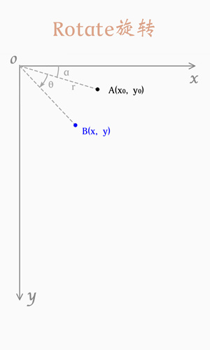 假定一个点 A(x0, y0) ,距离原点距离为 r, 与水平轴夹角为 α 度, 绕原点旋转 θ 度, 旋转后为点 B(x, y) 如下: