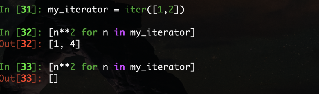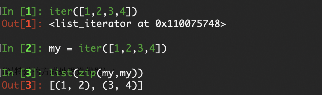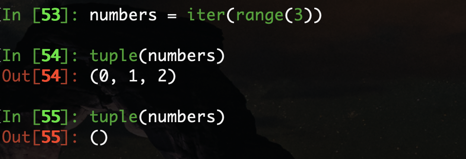 而且你会知道,当遍历它时,这些元素将从迭代器中被消耗掉,有时候这个特性可以派上用场(以特殊的方式处理迭代器):