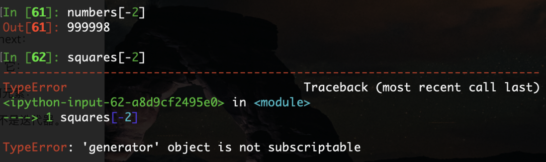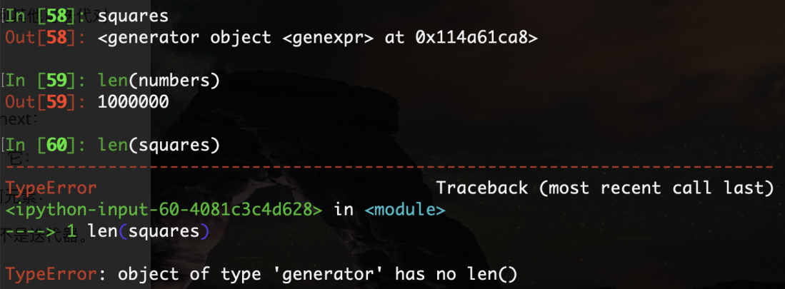 经常说迭代器是惰性的一次性可迭代对象。 「惰性」是因为他们只循环计算项目,「单次使用是因为一旦从一个迭代器中「消费」了一个元素之后,这个元素就永远消失了。