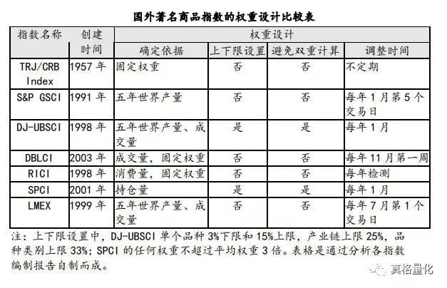 商品指数的不同设计目标和原则决定了商品指数的权重设计差异。下面主要从权重确定依据、权重限制、权重双重计算和权重调整四个方面比较各商品指数的权重设计差异。