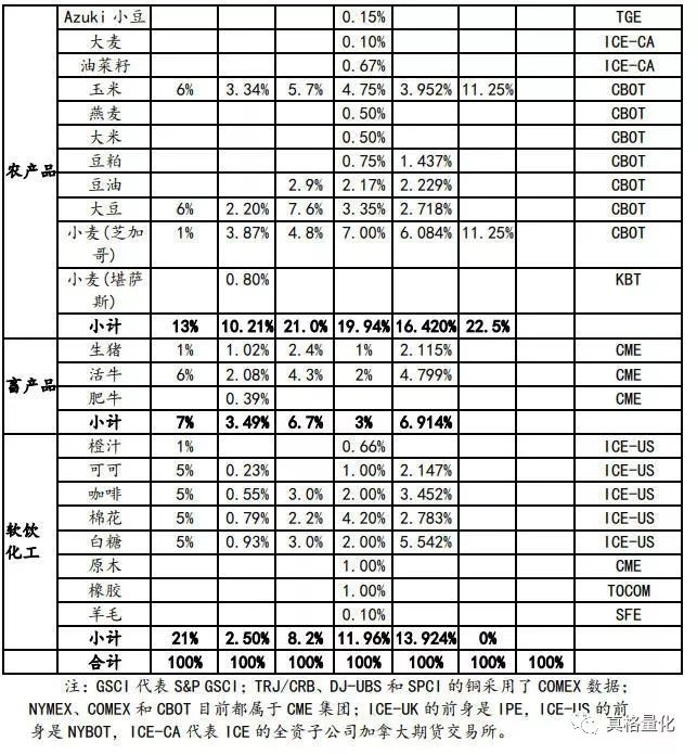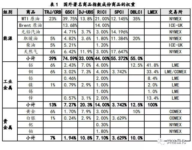 全球历史最悠久的商品指数是由美国商品研究局推出的 CRB 商品指数,最早可追溯到 1957 年,最初由 2 种现货、26 种期货商品构成。到目前为止已经经历了十次调整,其中最近一次是 2005 年,Reuters 与 Jefferies 的金融产品部合作修正了 CRB 指数,并重新命名为 Reuters/Jefferies CRB 指数,简称为“RJ/CRB 指数”。2008年 Reuters 公司与 Thomson 公司合并,2009 年该指数被重新命名为Thomson Reuters/Jefferies CRB 指数,简称为“TRJ/CRB” 。而标普-高盛商品指数(S&P GSCI)和道琼斯-UBS 商品指数(DJ-UBSCI)则是国际市场上资金跟踪量排名前两位的商品指数,是全球包括养老基金、保险公司等长期投资者投资商品市场运用得最多的商品指数,其中,2007 年 2 月,标准普尔公司从高盛公司手中购买了 GSCI 指数,并被重新命名为标准普尔高盛商品指数(S&P GSCI),同年标准普尔终止了公司原有的标准普尔商品指数(SPCI);DJ-UBSCI 就是原来的 DJ-AIGCI,2009 年 5 月,UBS 收购了该指数并重新命名其为DJ-UBSCI。德意志银行流动商品指数(DBLCI)和罗杰斯国际商品指数(RICI)是分别定位为全球最具有流动性的商品指数和全球覆盖范围最广的商品指数,所以 DBLCI 和 RICI 分别是综合指数中成份商品最少(6 个)和最多(36 个)的指数。而由伦敦金属交易所(LME)推出的金属指数(LMEX)更是为我们编制分类指数提供了参考。将上面提及的各著名商品指数最新成份商品的权重及上市交易所列于下表,其中除了 SPCI 采用的是 2007 年权重(标普公司在 2007 年收购 GSCI 后,同年年末停止了自身的 SPCI),其他指数均采用的是 2009 年权重。