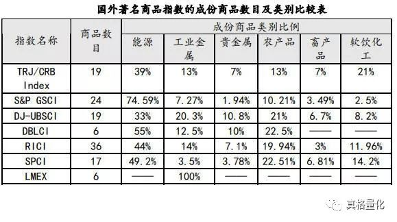 商品指数的不同设计目标和原则决定了入选商品指数成份商品的数目和类别的差异。通过比较各著名商品指数的成份商品数目及类别差异(见下表),可以发现罗杰斯商品指数(RICI)包括的商品数目最多(达 36 个),德意志银行流通商品指数(DBLCI)包括的商品数目最少(仅有 6 个)。商品指数包括的商品数目越多,对特定商品或类别的敏感性就越弱。从各成份商品的类别比例上看,除了 LMEX是金属分类指数外,其他指数都是综合指数;在综合指数中,S&P GSCI指数的能源类比例最高(将近 75%),各指数中能源类比例最低也达到 33%(DJ-UBSCI,多样性原则导致的结果)。