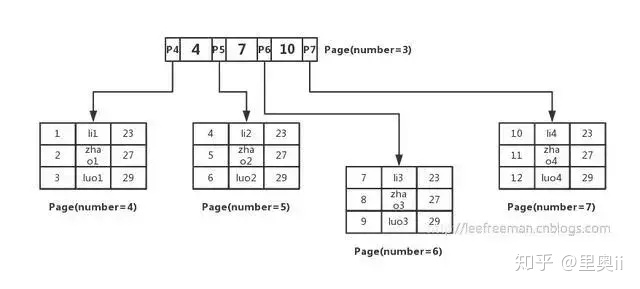 除了存放数据的页以外,还有存放键值+指针的页,如图中page number=3的页,该页存放键值和指向数据页的指针,这样的页由N个键值+指针组成。