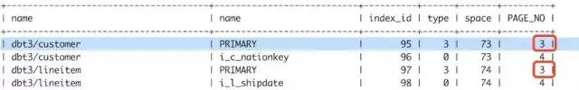 可以看出数据库dbt3下的customer表、lineitem表主键索引根页的page number均为3,而其他的二级索引page number为4。