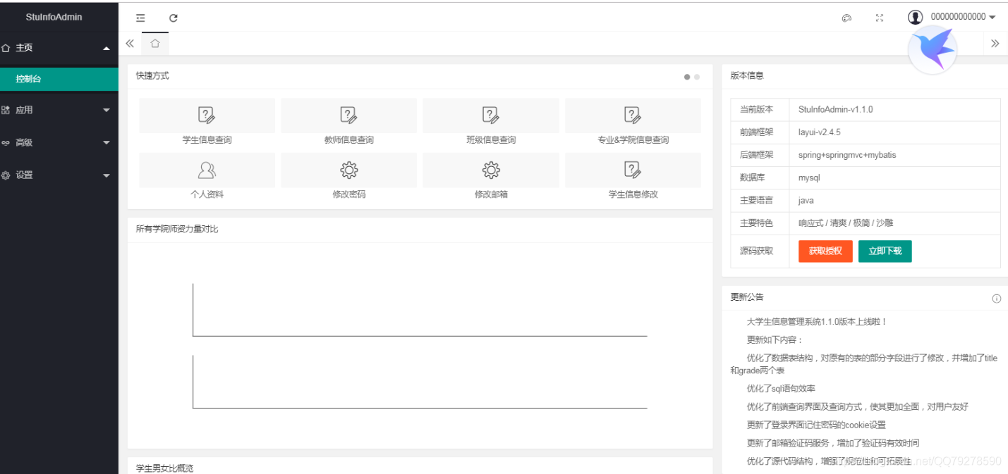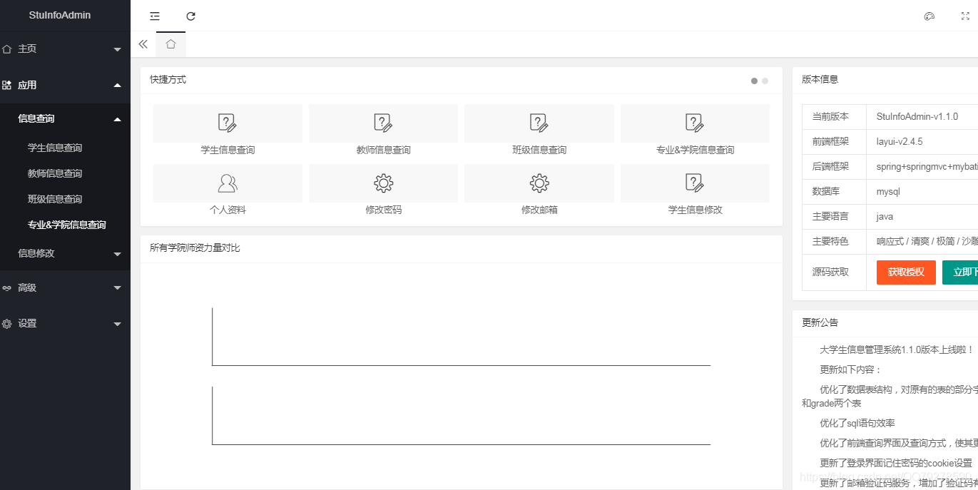 这个项目是一个大学生信息管理系统,提供用户级别的登录注册资料管理,信息查询,信息修改(管理员权利),简单的数据可视化分析等功能,也有基本的安全性保障