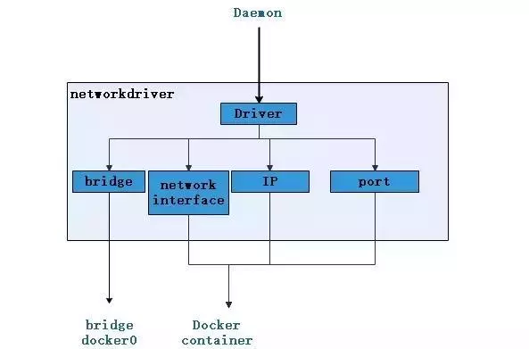 networkdriver的用途是完成Docker容器网络环境的配置,其中包括Docker启动时为Docker环境创建网桥;Docker容器创建时为其创建专属虚拟网卡设备;以及为Docker容器分配IP、端口并与宿主机做端口映射,设置容器防火墙策略等。networkdriver的架构如下: