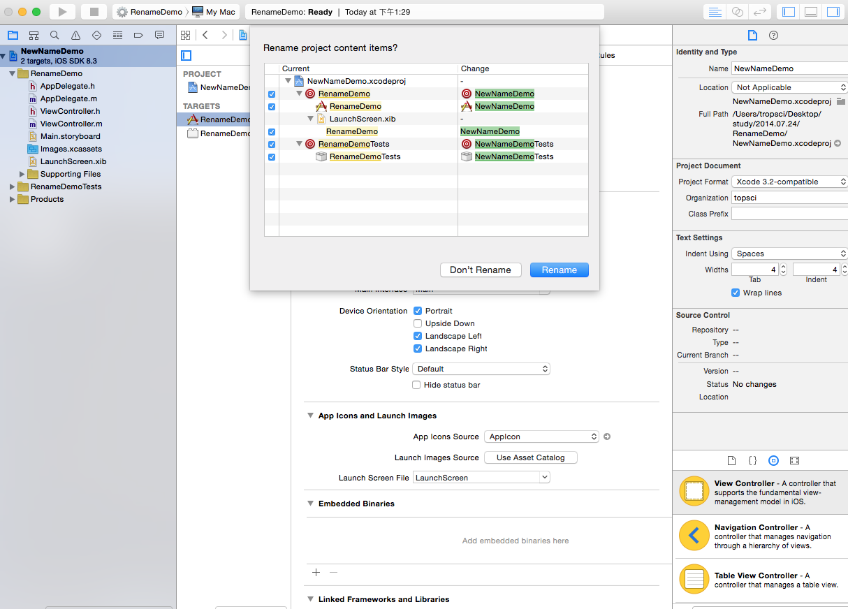 这里,Xcode 列举出了可以为我们做的更改两个 target 的名称,这个更改,其实也是为我们的 App 变名称了,如果你没有自己设定 App 的名称的话,咱们之前的 App 应该是 RenameDemo ,现在如果,重命名成功的话,就会变成 NewNameDemo 。