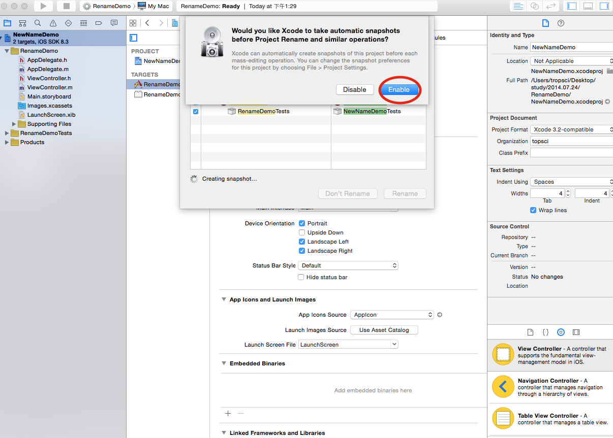 点击 Rename,让 Xcode 为我们重命名一部分。此时,会提示你需不需要 Xcode 为你做 snapshot,我们这里选择 Enable ,这个是一个 Xcode 功能,我们也可以在 File > Project Settings 中关掉它。