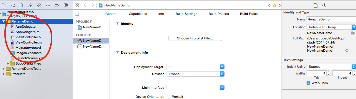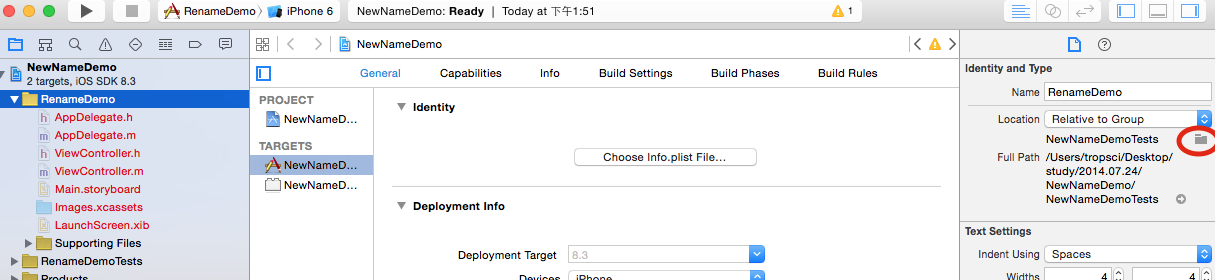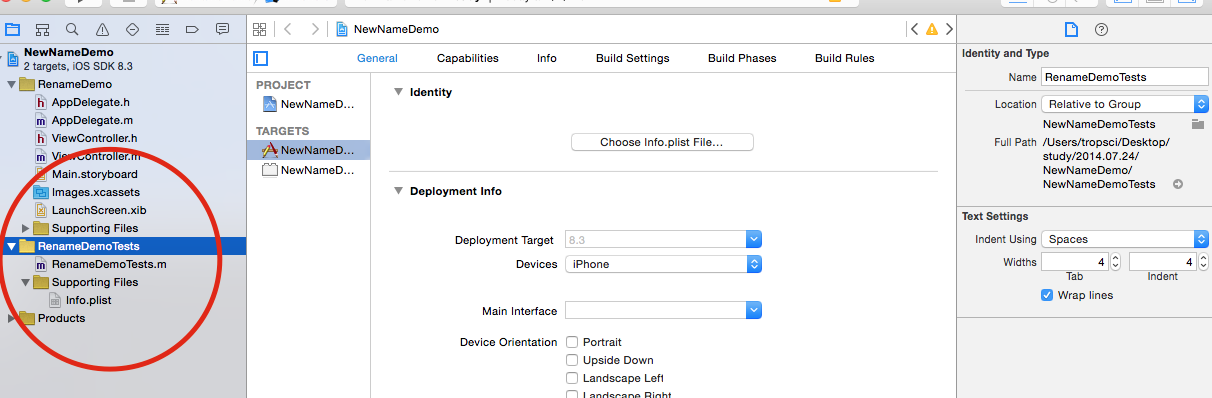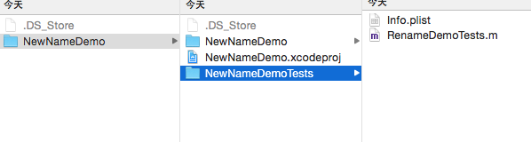 把源文件分组名称和 test 源文件分组名称改成NewNameDemo和NewNameDemoTests