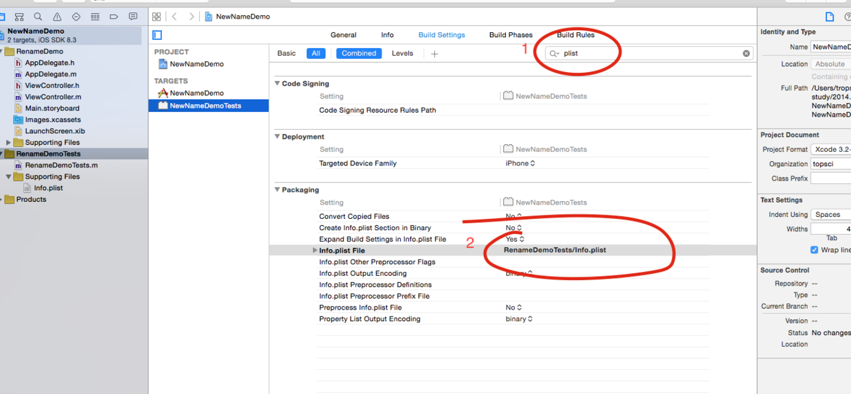 选择 NewNameDemoTests target,并选择 Build Settings 标签,搜索一下plist,你就会看到如下的界面