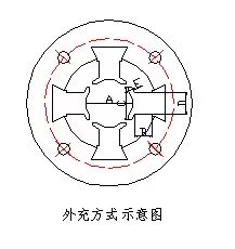 图中根据所充磁的四极定子决定A、B、C、D、E相关参数,由于设计规则涉及到公司技术机密,各尺寸计算规格和公式不能提供。请用户谅解。