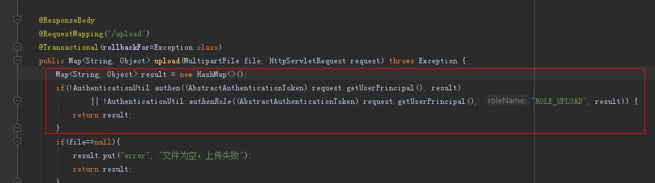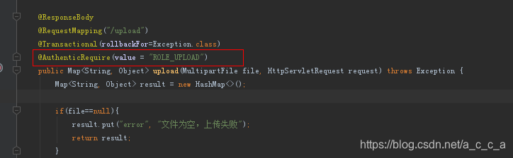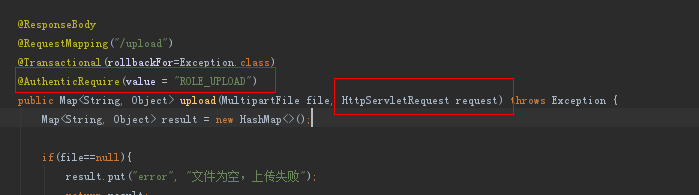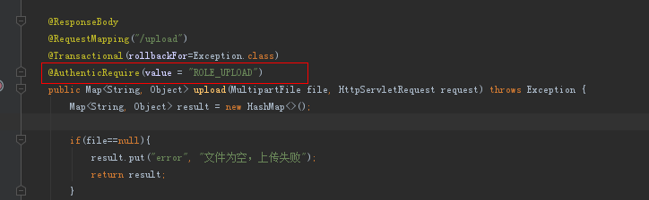 上面的例子是一个上传文件后台请求,我们需要判断这个用户是否有上传文件的权限。在这里我定义了一个工具类AuthenticationUtil,用来判断用户有没有登录(authen),和判断用户是否具有某个权限(authenRole),并把判断结果放到Map中。如果没有权限,就不再执行后面的语句。假如我每个请求都需要判断权限,那么每个请求的开头都需要加这样5行代码,这样代码重用性就低。而且controller里面不能专注关心业务,还混入了权限的代码。
