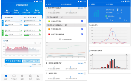 采集现场产污、治污设施用电状态,监视企业及其车间设备、监测点各级的运行情况,设备启停阀值,企业整体用电中显示企业停产的阈值。